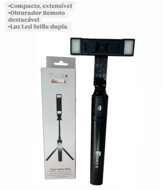 Tripé Selfie Stick com Luz Led Dupla, compacto e extensível, ideal para fotos e vídeos incríveis. Possui obturador remoto destacável para maior praticidade. Perfeito para selfies, fotos em grupo e vídeos.