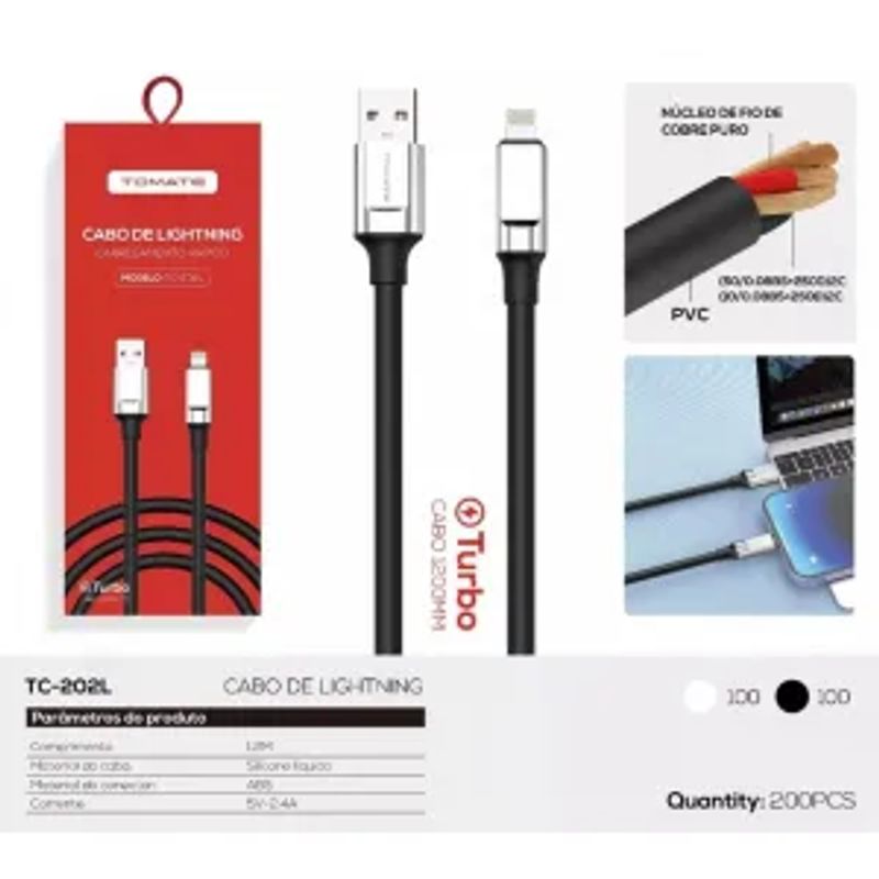 O Cabo de Dados Turbo USB para iPhone da Tomate, modelo TC-202L, foi desenvolvido para oferecer um carregamento rápido e eficiente para os dispositivos da Apple. Com 1.2 metros de comprimento, esse cabo é ideal para carregar e sincronizar iPhones, iPads e iPods, proporcionando uma carga rápida e eficiente com uma corrente de 5V-2.4A.