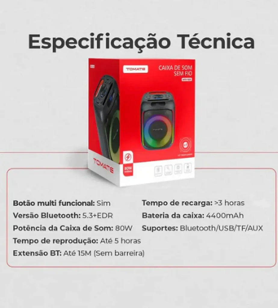 CAIXA DE SOM BLUETOOTH RGB 80W TOMATE MTS-1003