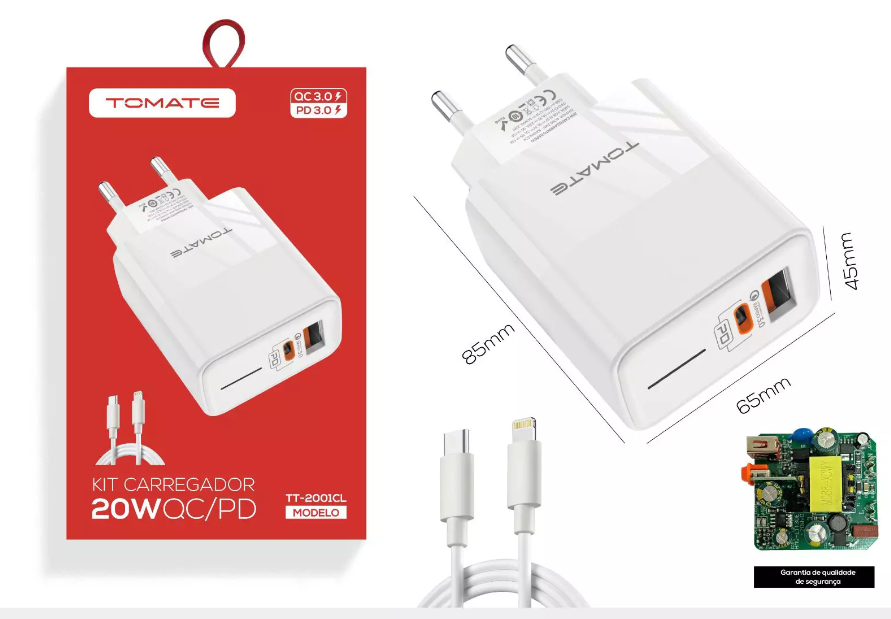 O Kit Carregador 20W Turbo Tipo-C da Tomate é a escolha ideal para quem busca praticidade e eficiência no carregamento de dispositivos. Com saídas USB-A e Tipo-C, é possível carregar diversos aparelhos simultaneamente. A entrada universal AC100-240V-50/60HZ garante compatibilidade global, enquanto o cabo Tipo-C para Lightning de 1 metro proporciona maior conveniência.