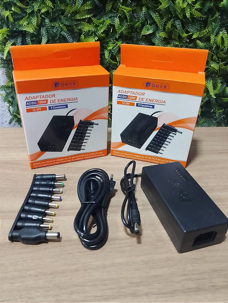 - Potência de 120 W atende a modelos que exigem altos níveis de energia (ex.: 19–20 V, 4–4,5 A)