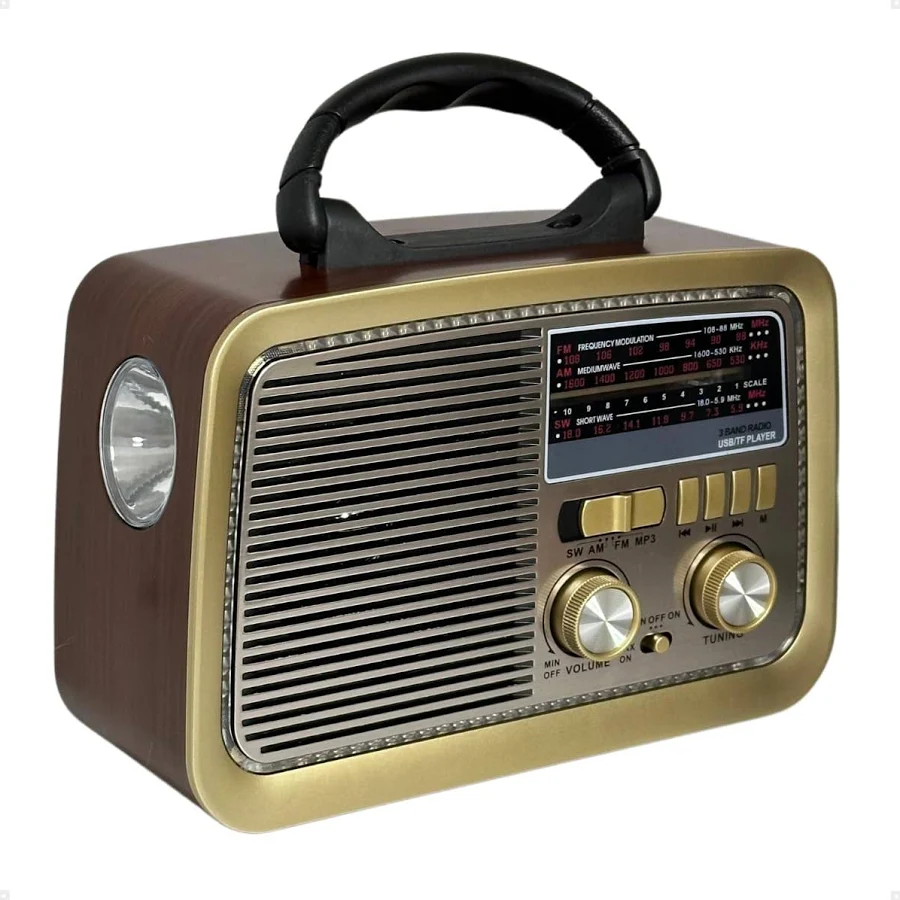 Seu acabamento combina detalhes retrô (botões analógicos, antena telescópica, mostradores) com funcionalidades modernas, oferecendo uma experiência sonora completa e versátil para ouvir rádio, músicas e broadcasts em diferentes situações.