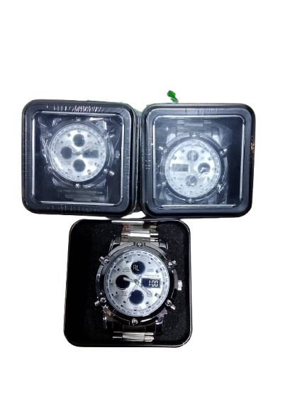 - Pulseira: aço inox ou ligas metálicas, com fecho dobrável; comprimento ~26 cm.